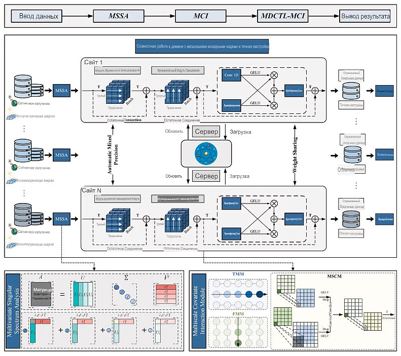 Для этого метод сначала применяет многомерный сингулярный спектральный анализ (MSSA) для снижения уровня шума и улучшения представления данных. Затем с помощью упрощённого подхода MCI моделируются взаимосвязи между переменными и выявляются глубинные временные закономерности. На третьем этапе стратегия MDCTL повышает надёжность модели в условиях низкого качества данных за счёт интеграции данных с нескольких фотоэлектрических площадок. Наконец, метод аддитивного объяснения Шепли (SHAP) определяет ключевые факторы, влияющие на точность прогнозирования.