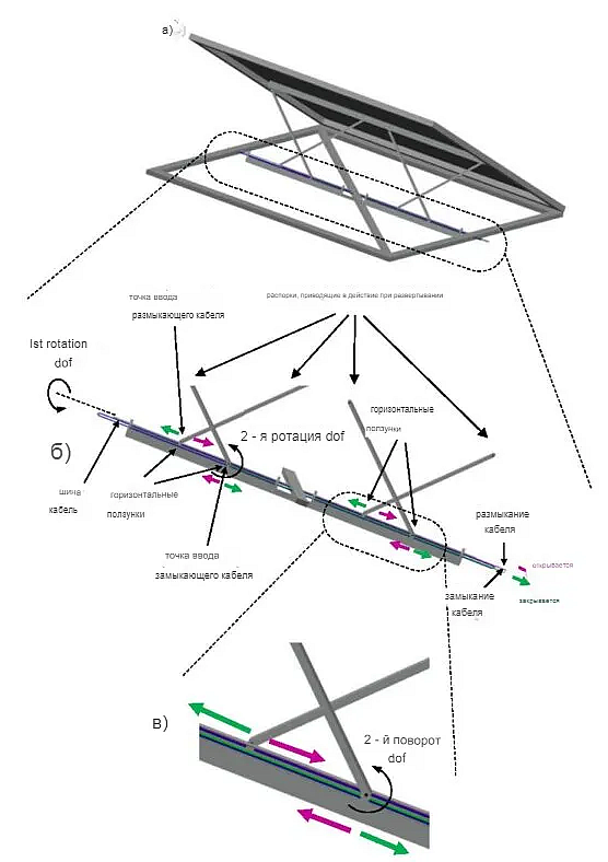 Благодаря модульной архитектуре тенсегрити, основанной на складывающихся и раскладывающихся активационных стойках, установленных на скользящих опорах, предлагаемый кровельный модуль можно легко интегрировать в различные конфигурации кровли. В нём используется специальная монтажная конструкция, состоящая из четырёх стоек, расположенных под панелями, верхние концы которых закреплены на четырёх неподвижных точках и соединены между собой продольной балкой. Кроме того, нижние концы соединены с горизонтальными ползунками, установленными на второй продольной балке, и приводятся в движение с помощью гибкого кабеля.