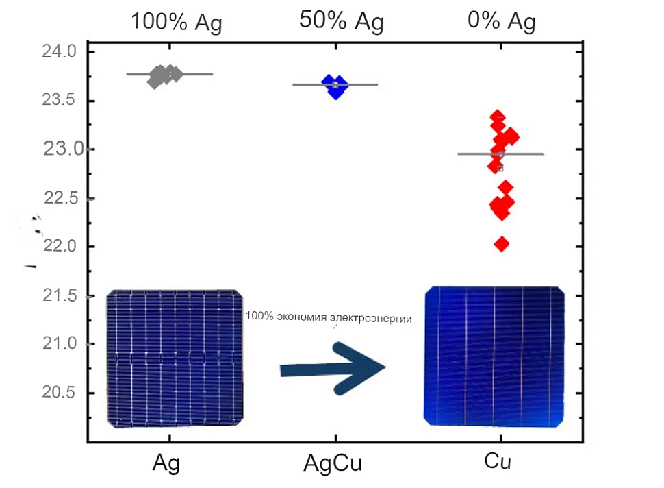 В статье «Достижение высокой эффективности кремниевых солнечных элементов с гетеропереходом с использованием металлизации без серебра», опубликованной в журнале Progress in Photovoltaics, исследовательская группа объяснила, что в их первоначальном анализе учитывались такие факторы, как линейное сопротивление, ширина контакта, соотношение сторон, удельное контактное сопротивление и объёмное сопротивление паст AgCu, Cu и Ag. «Это сравнение показало, что медь (Cu) демонстрирует самые высокие показатели эффективности, превосходя серебро-медь (AgCu), которая, в свою очередь, превосходит серебро (Ag)», — отметили они.