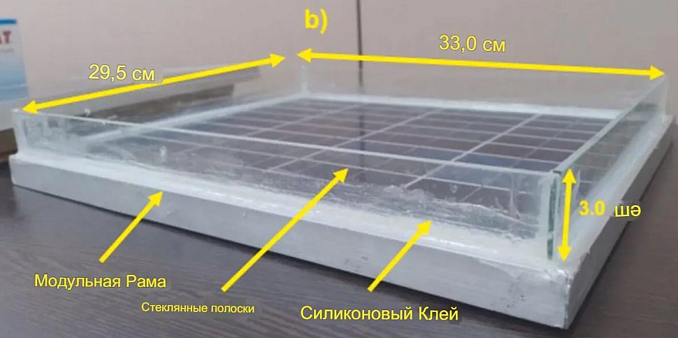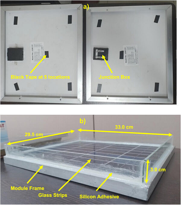 Для своего исследования группа использовала поликристаллический модуль мощностью 10 Вт и площадью 0,105 м2. По внутреннему периметру модуля с помощью силиконового клея были размещены четыре прозрачные полоски из оконного стекла толщиной 0,003 м и высотой 0,03 м, между которыми оставалось пространство для морской воды. Солёность морской воды составляла 30,00 промилле, а уровень pH — 8,04. Толщина слоя морской воды составляла 30 мм, 5 мм или 4 мм.