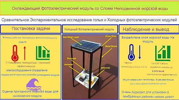 Этот метод охлаждения был экспериментально протестирован в сравнении с эталонным неохлаждаемым модулем при различной толщине слоя морской воды.