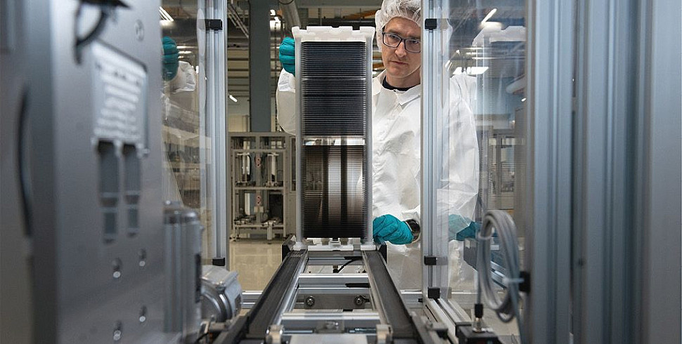 Тандемные ячейки на основе перовскита HJT в производстве на заводе Oxford PV в Бранденбурге, Германия.