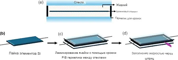 Исследователи припаяли элементы с помощью соединителей типа «собачья кость» и шин, а также нанесли полиизобутиленовый (PIB) герметик по краям нижнего стекла. Затем припаянные элементы поместили между двумя листами стекла и ламинировали в фотоэлектрическом ламинаторе при температуре 95 °C и давлении 400 мбар, чтобы полностью герметизировать модуль, не повредив элементы.
