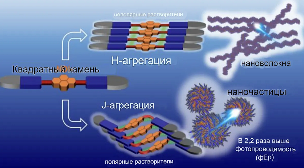 В зависимости от растворителя молекула спонтанно организуется в агрегаты J-типа, похожие на наночастицы, или в агрегаты H-типа, похожие на нановолокна.