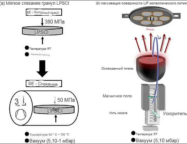 Чтобы решить эти проблемы, команда разработала процесс спекания при низкой температуре и низком давлении. Порошок LPSCl сначала подвергался одноосному прессованию при давлении 380 МПа и комнатной температуре в перчаточном боксе. Полученные методом холодного прессования гранулы затем перемещались в вакуумную камеру, соединённую с перчаточным боксом, и прессовались при давлении 50 МПа в течение шести часов при температурах 60 °C, 80 °C и 100 °C.