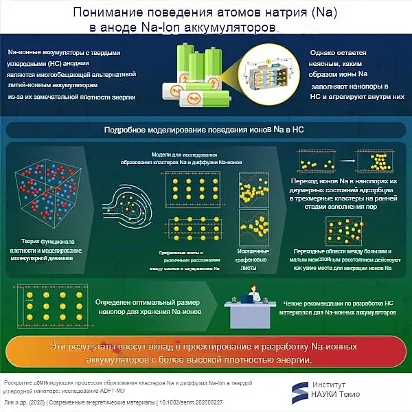 Японские исследователи с помощью суперкомпьютерного моделирования выяснили, как ионы натрия образуют кластеры и перемещаются внутри углеродных анодов, а также определили размеры нанопор и переходные области, которые влияют на диффузию и скорость работы натрий-ионных аккумуляторов. Полученные результаты дают рекомендации по оптимизации углеродных анодов для повышения удельной энергоемкости, увеличения количества циклов и улучшения перспектив коммерциализации.