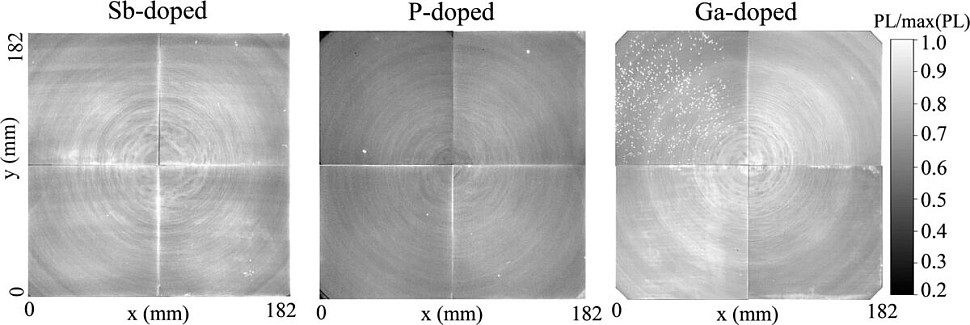 Изображения распределения легирующих примесей по всей пластине (182 × 182 мм2) на основе PL-сканирования пластин с затравкой, легированных сурьмой, фосфором и галлием.